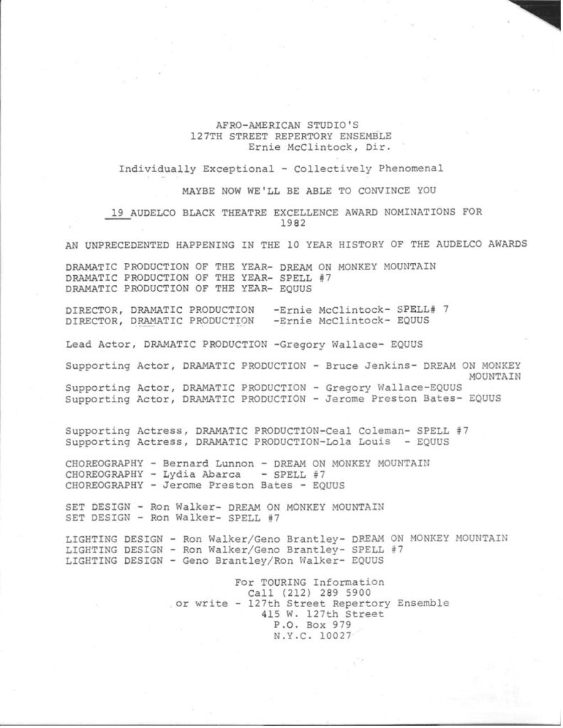 by Khalid Y. Long The Journal of American Drama and Theatre Volume 33, Number 2 (Spring 2021) ISNN 2376-4236 ©2021 by Martin E. Segal Theatre Center Glenda Dickerson (1945-2012) is often recognized as a pioneering Black woman theatre director.[1] A more expansive view of her career, however, would highlight Dickerson’s […]